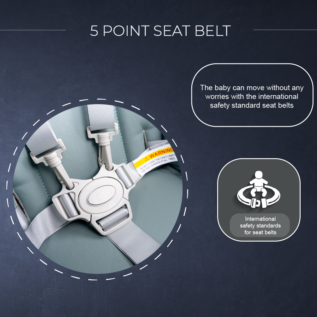 - 5 Point safety seat belt, baby can move around without worries
